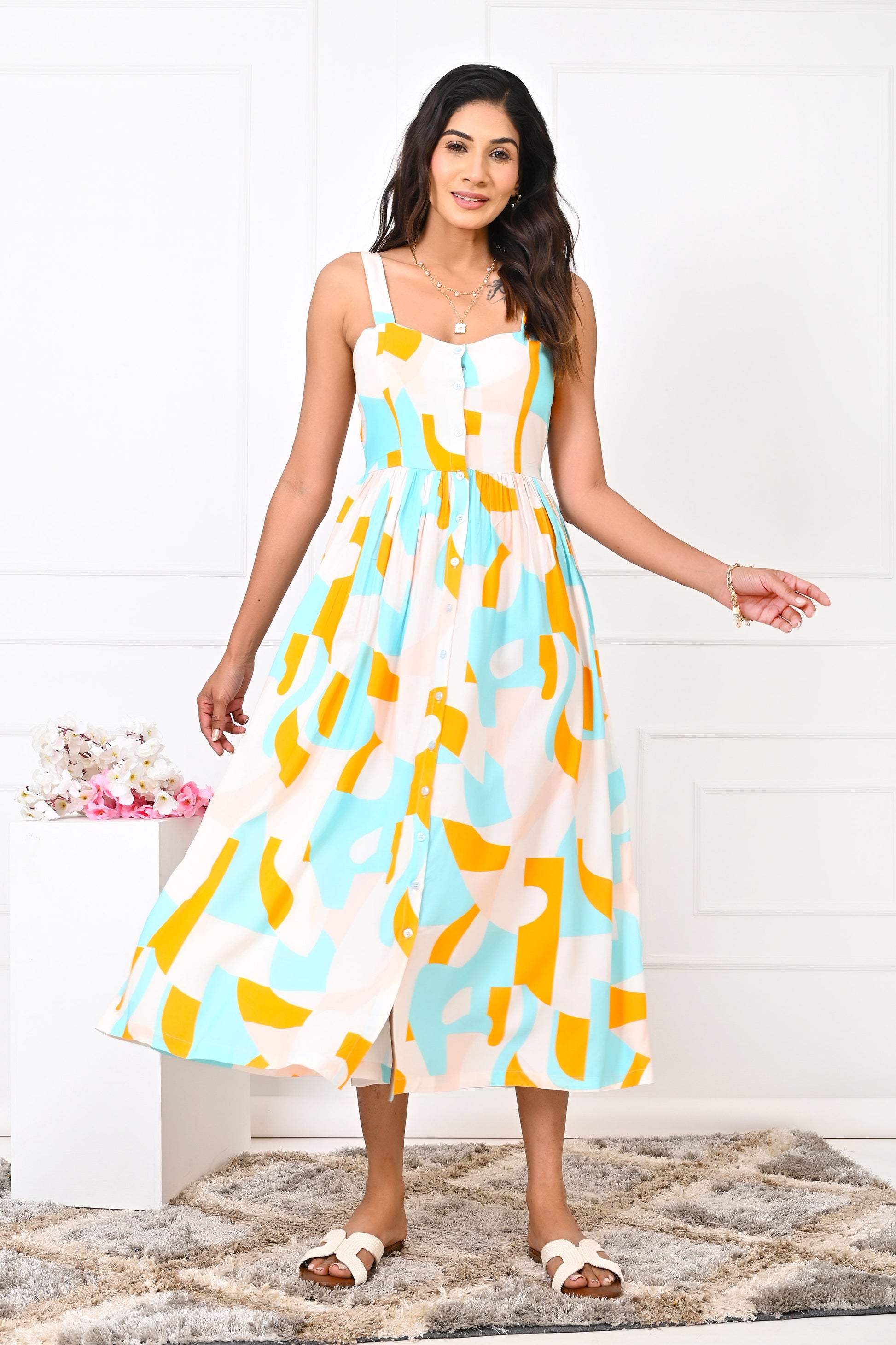Women’s Abstract Kurta Dress – Elegant Turquoise & Orange Resort Wear