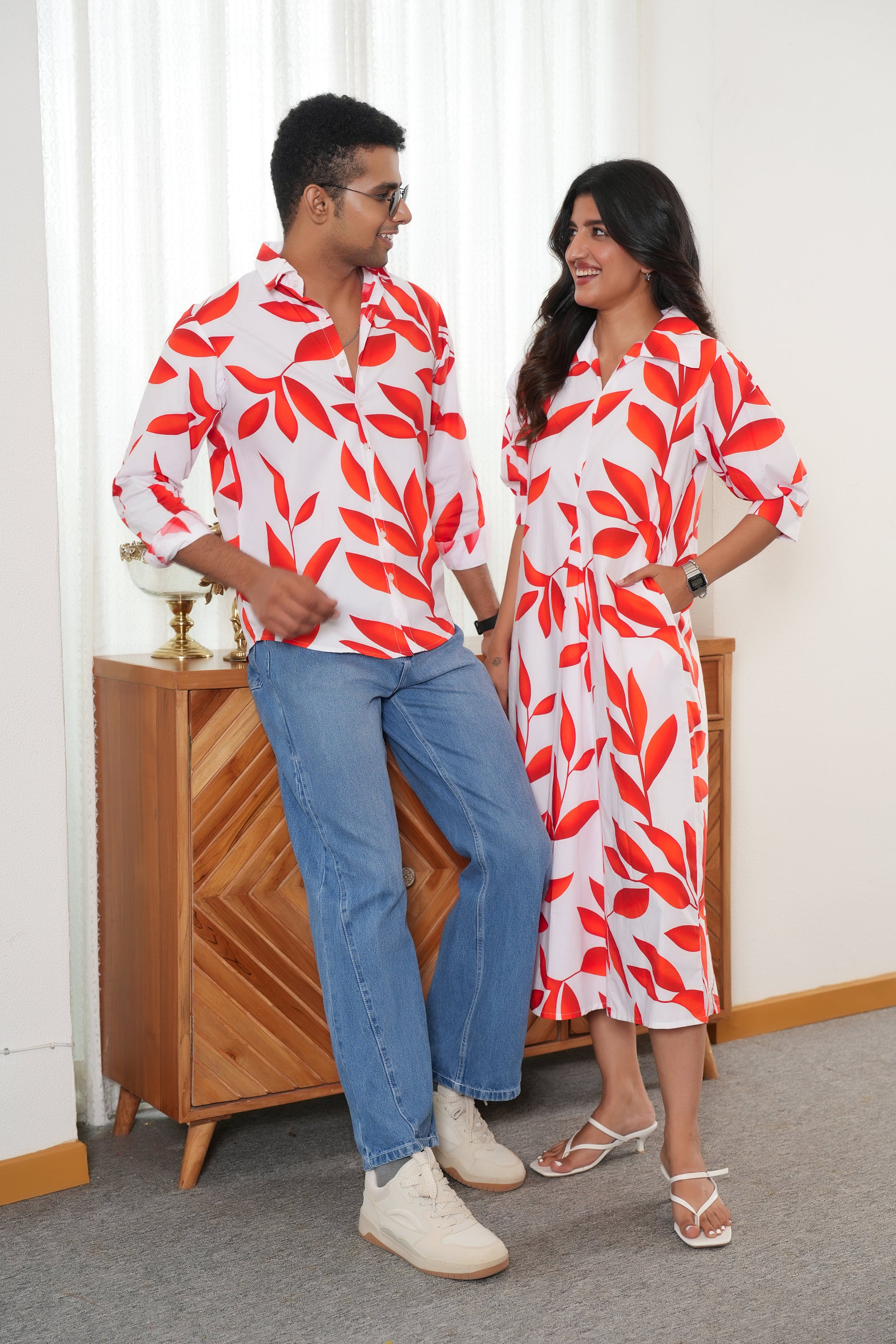 Couple twinning set with cotton shirt and dress, perfect for Valentine celebrations, beach dates, romantic dinners, pool parties and vacation wear. A great choice for Goa holidays and island trips.
