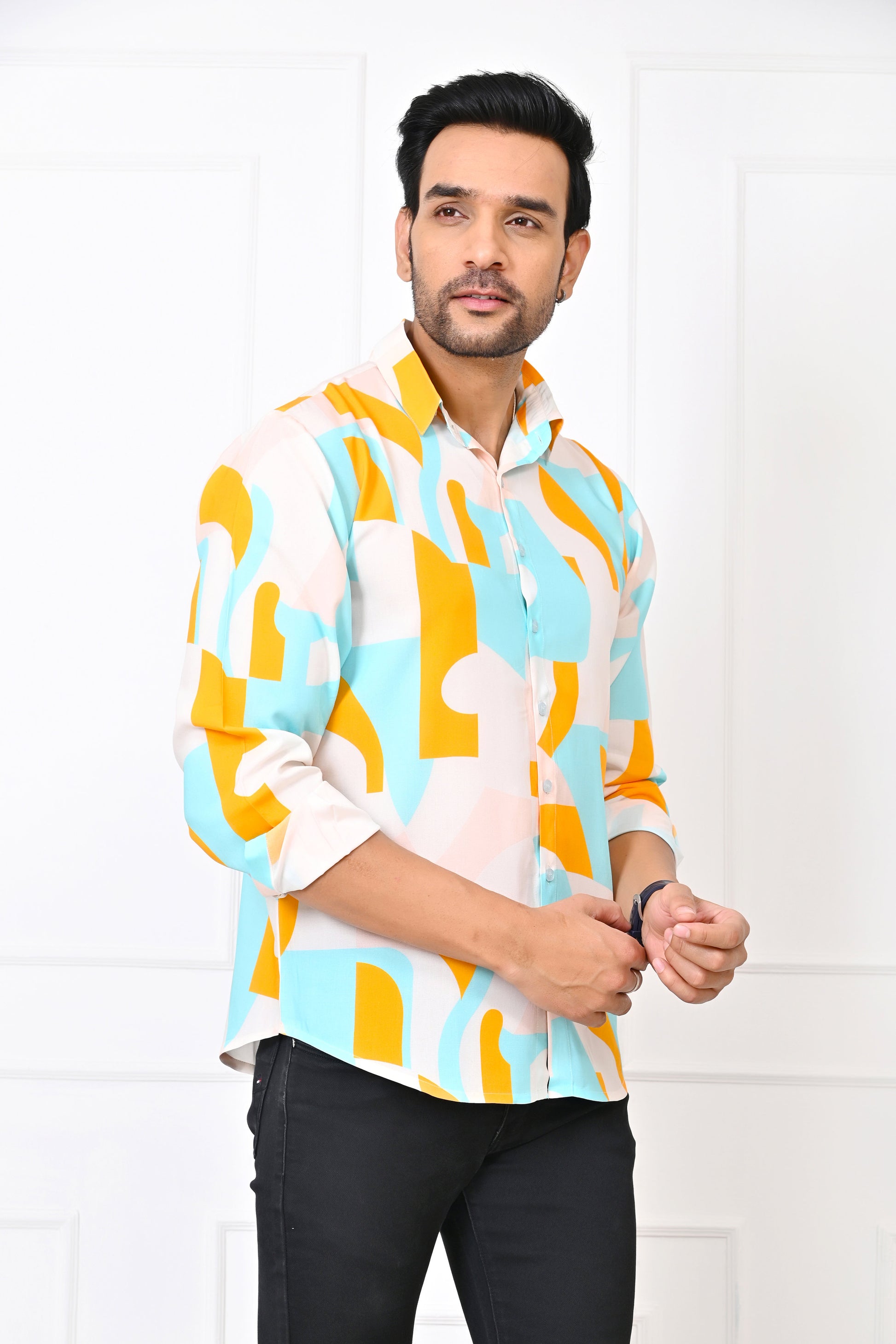 Make a statement with this abstract print full sleeve shirt. Lightweight and breathable, ideal for Phuket evenings, Santorini sunsets, and Dubai nightlife. A versatile piece for tropical vacations.