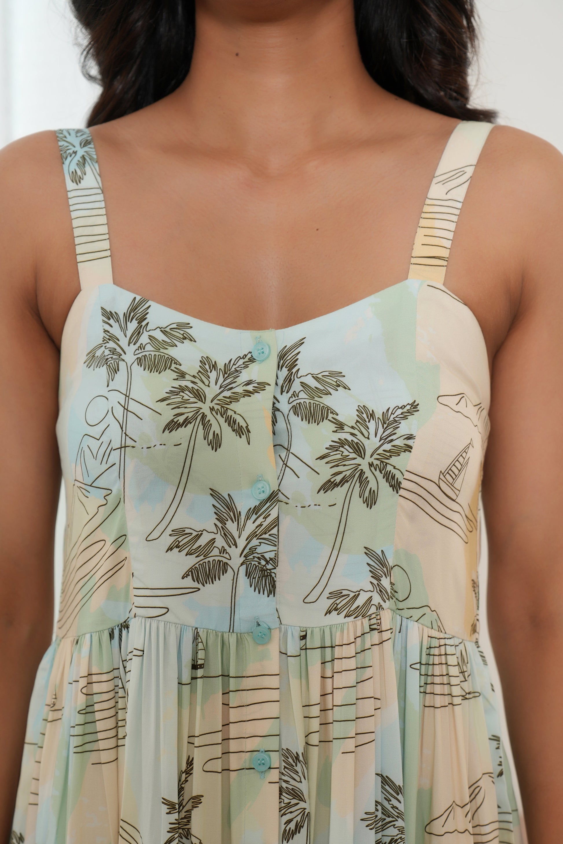 This exquisite collection features a unique watercolor print of a serene coastal landscape: a stunning sunrise or sunset over rolling hills, silhouettes of graceful palm trees, and a peaceful boat floating on the water body. This artistic detail makes these outfits look and feel like wearable art.