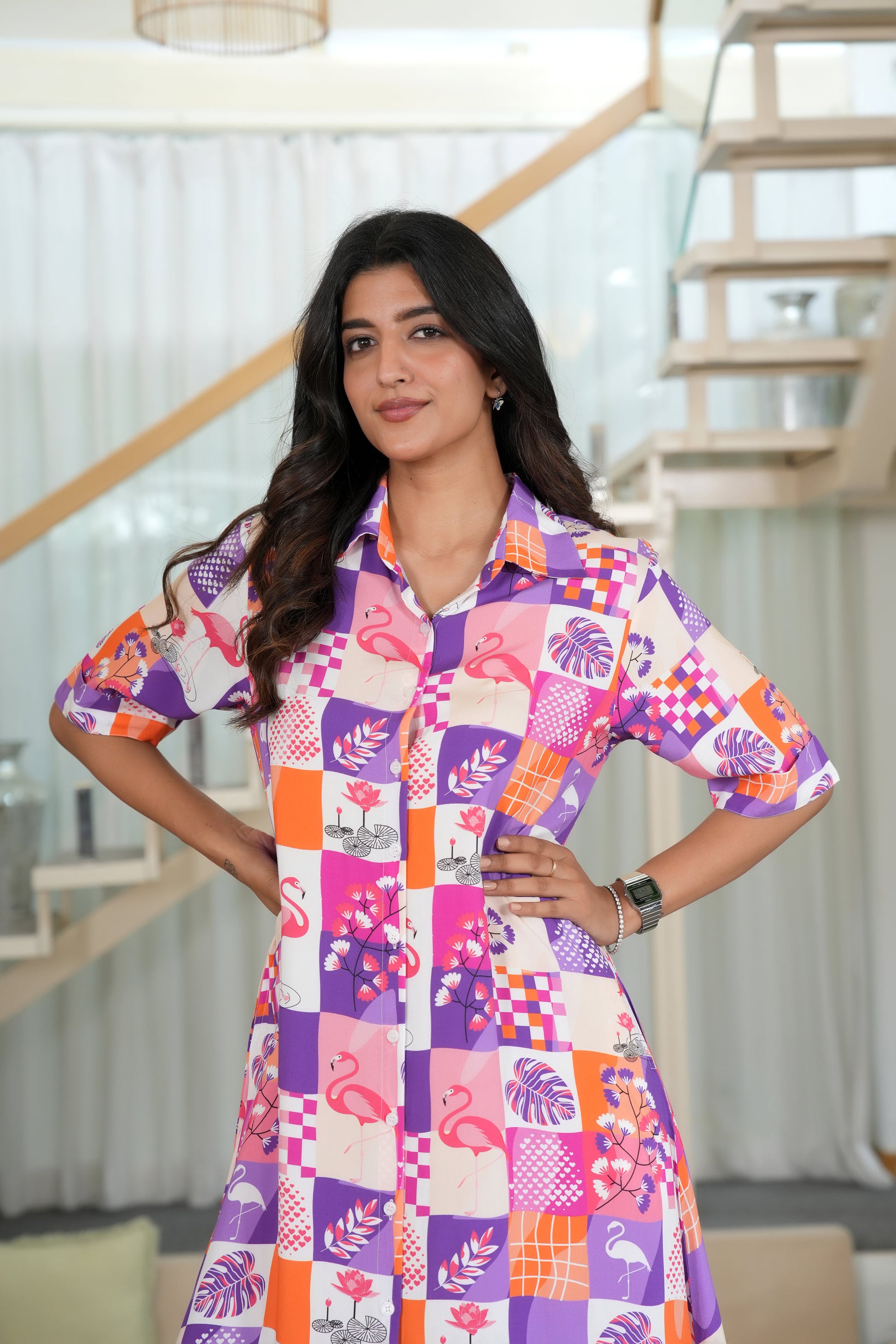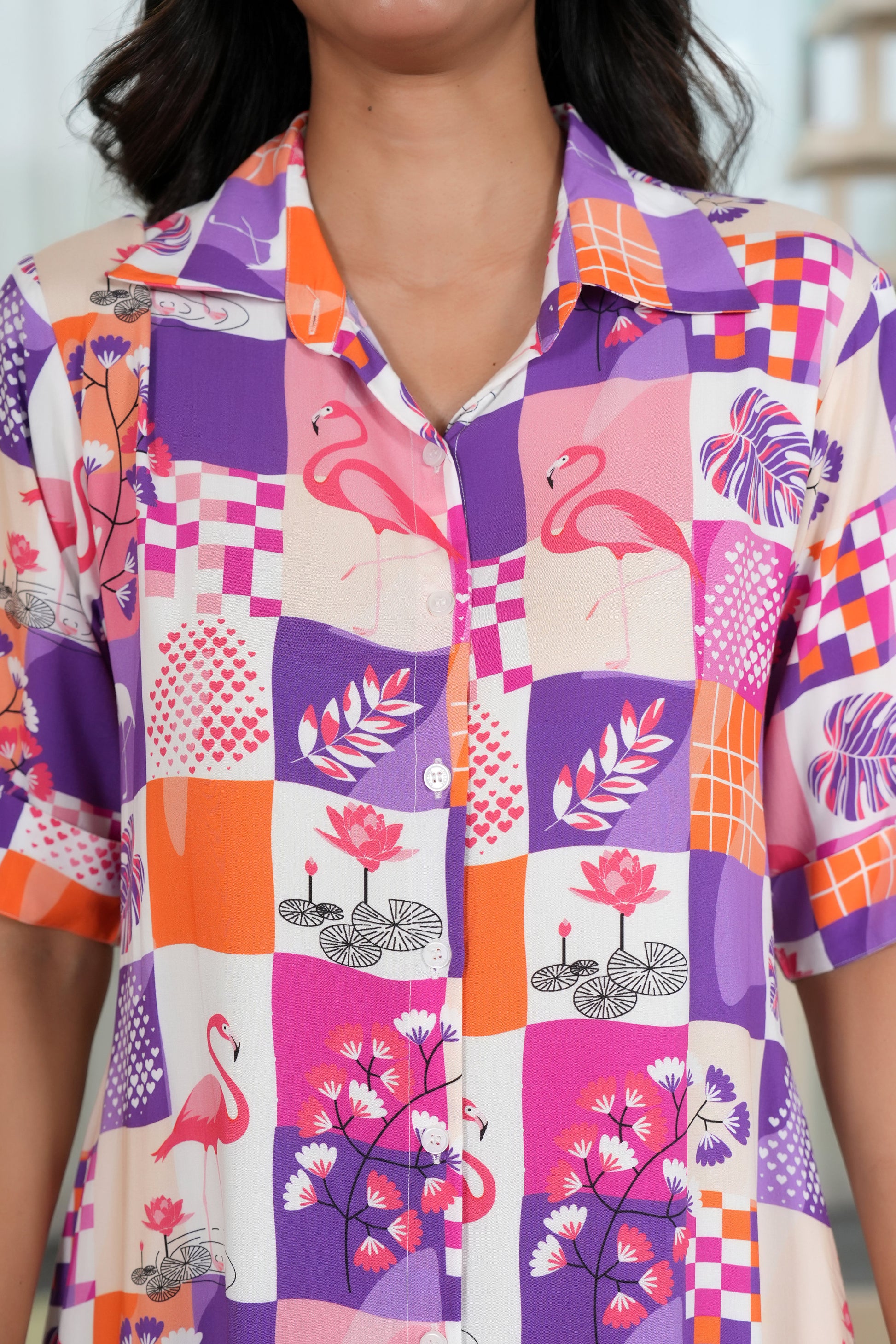 This stunning collection features a complex and imaginative print set against a rich, purple base. The design is a playful blend of whimsical flamingos, vibrant pink florals, geometric checks, water ripples, and hidden hearts, all brought to life by a dynamic palette of purple, pink, and sunny orange.